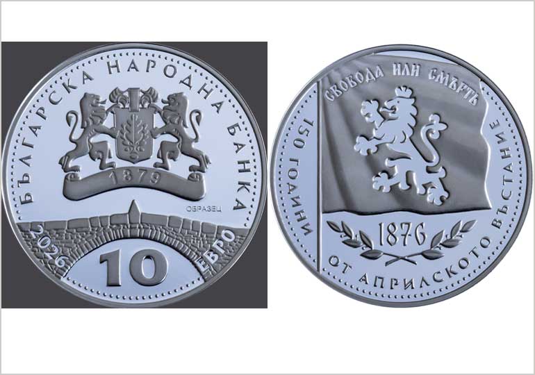 Българската народна банка (БНБ) пуска в обращение сребърна колекционерска монета на тема „150 години от Априлското въстание“ с номинална стойност 10 евро, емисия 2026 г., от...
