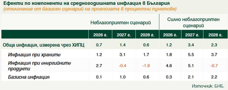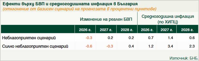 - Неблагоприятен сценарий: Допуска се (табл. 2), че през второто тримесечие на 2026 г. около 40% от обичайните потоци на петрол и втечнен природен газ, преминаващи през Ормузкия проток, ще бъдат временно затруднени, главно поради блокиране на транспортни маршрути. Допуска се също, че няма да има нанесени съществени щети върху енергийната инфраструктура в региона. Това води до значително, но краткотрайно повишение на цените на енергийните суровини и до умерено нарастване на несигурността на международните финансови пазари. Нарушенията в доставките на тези суровини се запазват до третото тримесечие на 2026 г., след което се наблюдава сравнително бързо възстановяване на търговските потоци.