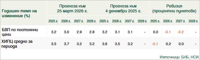 Спрямо прогнозата от декември 2025 г. БНБ очаква по-нисък растеж на реалния БВП за 2026 г. и 2027 г. Ревизията с 0.1 процентни пункта за 2026 г. се дължи на по-нисък растеж на износа на стоки предвид по-силната от първоначално очакваната реализация на износа през втората половина на 2025 г. и повишената несигурност във външната среда. Тези фактори, в комбинация с наблюдаваното влошаване на бизнес климата в края на 2025 г., са предпоставка и за по-слаб растеж на частните инвестиции през 2026 г. За 2027 г. растежът на реалния БВП е понижен с 0.2 процентни пункта, което се определя от очаквано по-ниско потребление на правителството.