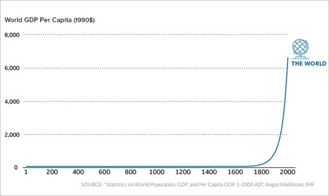 Макар да няма пряка причинно-следствена връзка между „Богатството на народите“, посоченото в тази книга се материализира житейски и след 2000 (след дългогодишните историко-статистически изследвания на Ангъс Мадисън) става възможно да бъде измерено. Затова вчера бе многократно споделена едно от най-известните графики, която показва напредъка на човечеството.