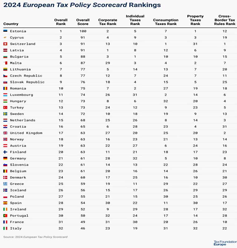 Според различни индекси за качество на данъчната политика България е сред първенците в Европа. Ето такъв индекс на Европейската данъчна фондация.