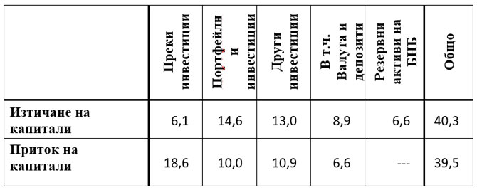 Логично се отчита съществена разлика в структурата на изтичането на капитали, от една страна, и на притока на капитали, от друга. Съществена част (почти половината) от притока на чуждестранен капитал у нас е по-линия на преки инвестиции, докато инвестираните национални преки инвестиции в чужбина са около 15% от общия размер на изнесения капитал. При това, преките инвестиции са най-печеливши, най-изгодни и с устойчива почелба. Има значение и видът на преките инвестиции, които за българските преки инвестиции са предимно недвижимо имущество в чужбина – не толкова като бизнес начинание, а като вложения в имоти.