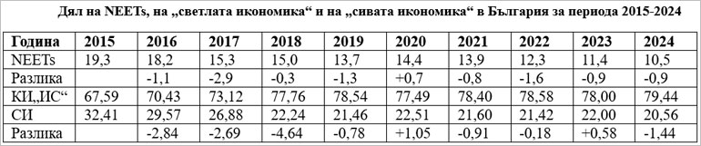Делът на младите хора, които не учат, не работят и не са обхванати от мерки за професионална квалификация е намалял от 2015 до 2024 година от 19,3% на 10,5%, тоест с 8,8 процентни пункта (п.п.). От друга страна, индексът „Икономиката на светло“ е нараснал от 67,59% на 79,44%, тоест с 11,85 п.п., респективно делът на „сивата икономика“ е намалял от 32,41% на 20,56%, тоест със същите 11,85 п.п.