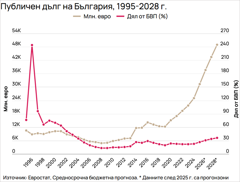 Средносрочната бюджетна прогноза[1], която съпровожда вече оттегления проект за бюджет за 2026 г. предполага удвояване на номиналната стойност на държавния дълг на страната – от 24,2 млрд. евро през 2024 г. до 49 млрд. евро през 2028 г. Заради очакванията за значителен икономически растеж през същия период, увеличението в размера на дълга, отнесен към БВП е с 13,5 пр.п. –  от 23,1% до 36,6%. Това постепенно застрашава позицията на България като една от държавите в ЕС с най-ниска задлъжнялост. По-важният въпрос е как ще бъде използван дългът. В крайна сметка, той е просто част от инструментариума на разположение на правителството, с който то да постигне заложените си цели. Като всеки друг инструмент, дългът не е сам по себе си добър или лош – най-важно е конкретното приложение на взетите назаем от бъдещето пари.