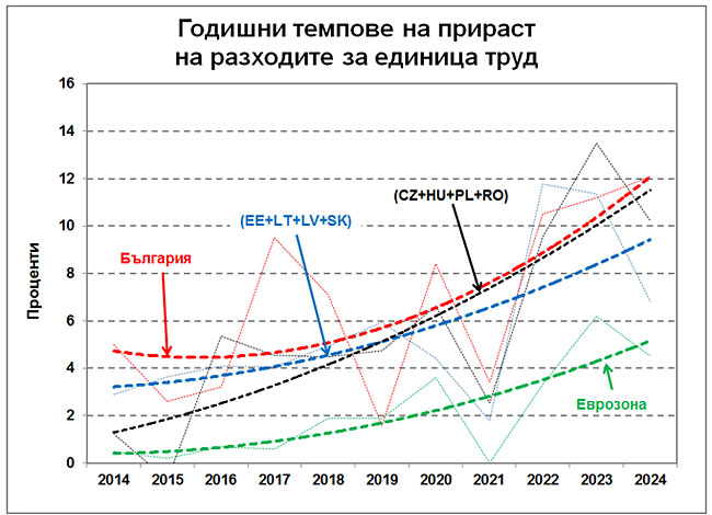 При всички отразени групи страни се наблюдава ясно изразен тренд на открояващо се изпреварващо повишение на разходите за труд, респ. на заплащането на труда. По-сдържани са темповете на прираст на разходите за труд в еврозоната като цяло, но в страните от ЦИЕ ежегодните прирасти на заплати през последните 4-5 години достигат до 10-12% годишно! Динамиката в България следва общия ход, но с минимално превишение.
