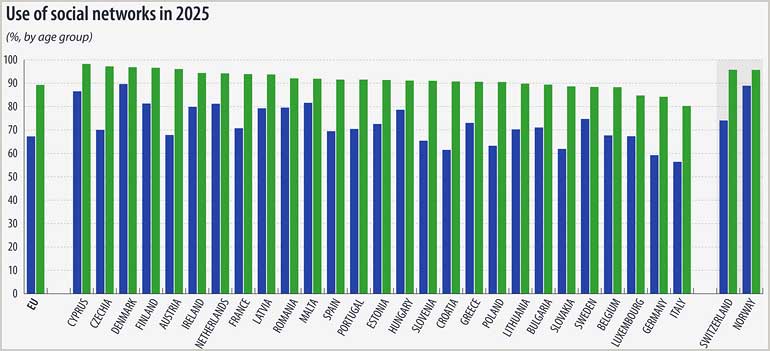 В 19 от 27-те страни от ЕС над 90% от младите хора са използвали социални мрежи. Най-високите дялове са в Кипър (98,3%), Чехия (97,2%), Дания (96,9%) и Финландия (96,6%), докато най-ниските са в Италия (80,3%), Германия (84,2%) и Люксембург (84,8%).