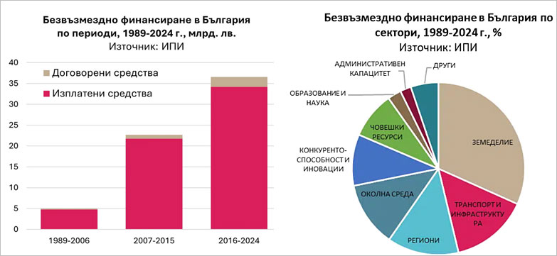 Общият обем на полученото безвъзмездно финансиране в България от началото на прехода до 2024 г. е близо 70 млрд. лева.