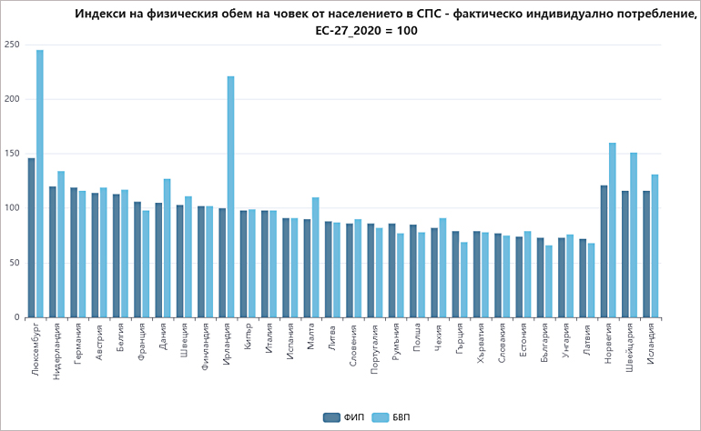 НСИ представя данни публикувани от Евростат, които са базирани на ревизираните паритети на покупателната способност (ППС) и на последните актуални данни за БВП на човек от населението.