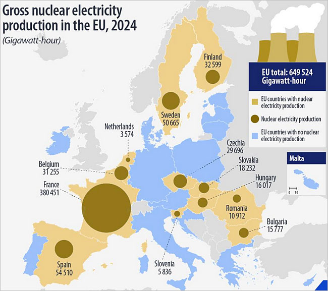 Най-големият производител на ядрена енергия в ЕС, Франция, е генерирал 58,6% от ядрената енергия в ЕС (380 451 GWh). Следва Испания с 54 510 GWh (8,4%), пред Швеция (50 665 GWh; 7,8%) и Финландия (32 599 GWh; 5,0%).