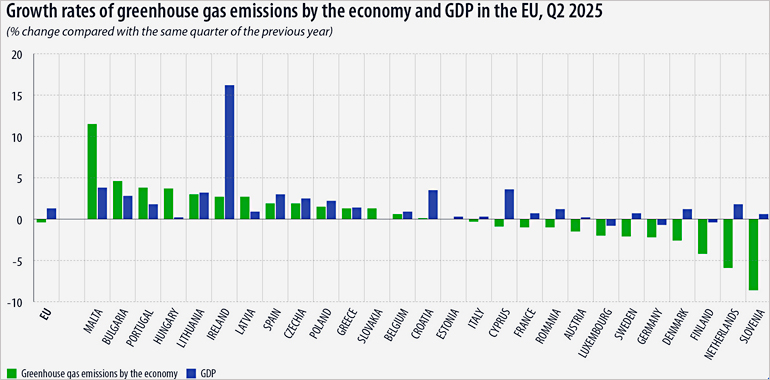 През второто тримесечие на 2025 г. годишно увеличение на емисиите на парникови газове е отчетено за 14 държави от ЕС, намаление има в 12 държави от ЕС, а Естония е регистрирала стабилни стойности.