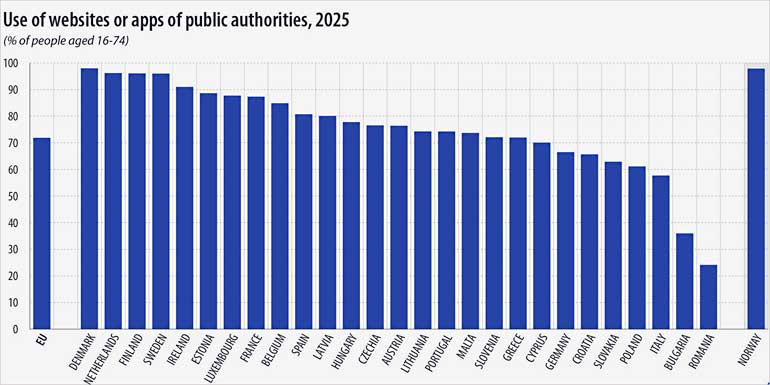 Страните от ЕС с най-високо използване на услугите на електронното управление са Дания (98,0% от хората са използвали уебсайтове или приложения на публични органи), Нидерландия (96,2%), Финландия (96,1%) и Швеция (96,0%). За разлика от тях, Румъния (24,1%), България (36,0%), и то със сериозна разлика, и Италия (57,7%) са регистрирали най-ниските дялове.