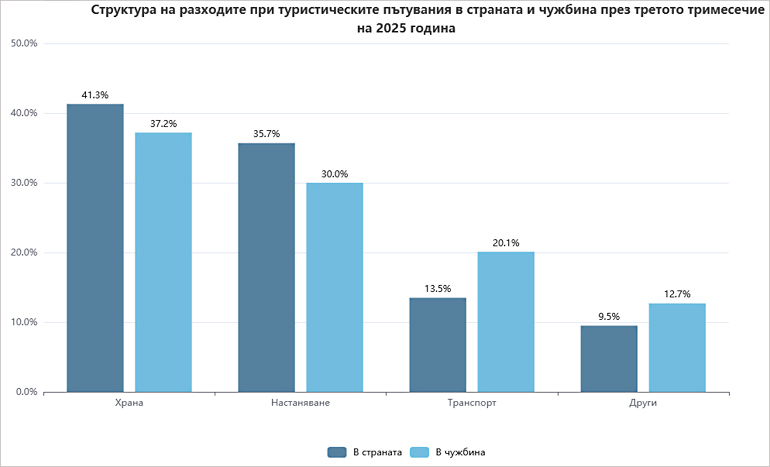 В структурата на разходите по видове с най-голям относителен дял както в страната, така и в чужбина, са тези за храна – 41.3 и 37.2%.