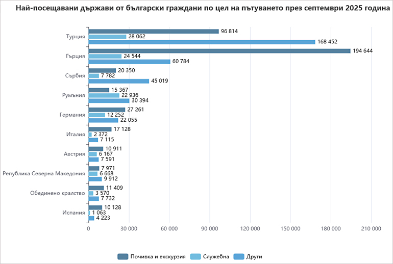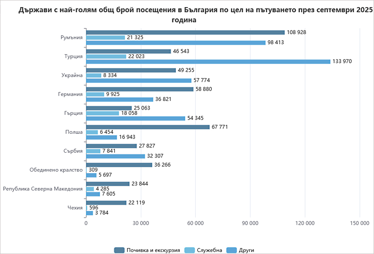 Най-много посещения в България са реализирали гражданите от: Румъния – 228.7 хил., Турция – 202.5 хил., Украйна – 115.4 хил., Германия – 105.6 хил., Гърция – 97.5 хил., Полша – 91.2 хил., Сърбия – 68.0 хил., Обединеното кралство – 42.3 хил., Република Северна Македония – 35.7 хил., Чехия – 26.5 хиляди.