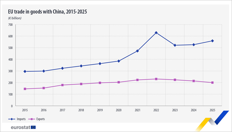 През 2025 г. ЕС е изнесъл за Китай стоки на стойност 199,6 милиарда евро, а вносът е за 559,4 милиарда евро, което е довело до търговски дефицит от 359,8 милиарда евро, сочат данни на Евростат.