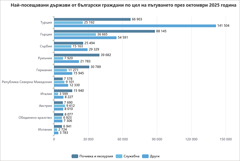 Най-голям брой пътувания на български граждани са осъществени към: Турция – 233.6 хил., Гърция – 179.4 хил., Сърбия – 70.0 хил., Румъния – 69.4 хил., Германия – 58.0 хил., Република Северна Македония – 29.0 хил., Италия – 27.8 хил., Австрия – 25.3 хил., Обединено Кралство – 22.3 хил., Испания – 13.4 хиляди.