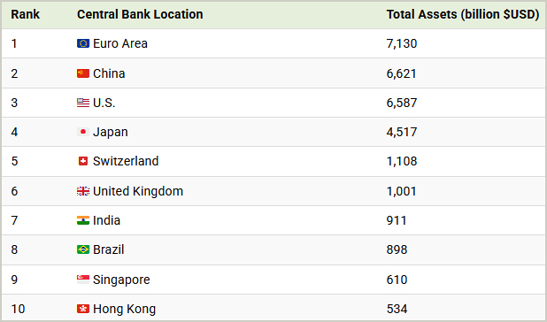 Тези три банки колективно държат над половината от активите на централните банки в света. Швейцария, въпреки по-малкото си население, държи над 1,1 трилиона долара, което е прекомерна цифра, обусловена от валутните интервенции и натрупването на резерви.