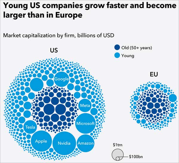 Седмичната графика на МВФ показва, че зад този дефицит се крие огромната трудност, пред която са изправени европейските фирми при разрастването си. В Съединените щати оценката на фондовия пазар на млади фирми (под 50-годишна възраст) е 42,9 трилиона долара, в сравнение с оскъдните 5 трилиона долара в Европейския съюз.