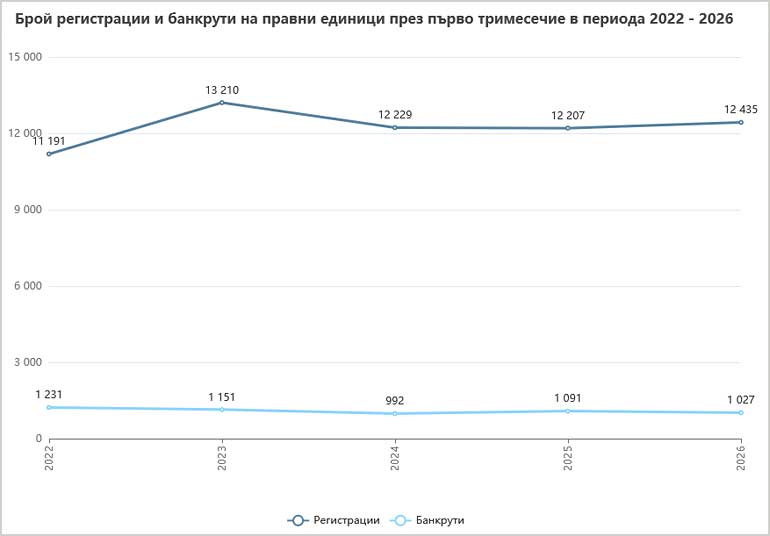 През този период новорегистрираните правни единици в страната са 12 435, а влезлите в процедура по несъстоятелност/фалит, в това число и обявените в несъстоятелност – 1 027. В сравнение със същото тримесечие на 2025 г. общият брой на новорегистрираните се увеличава с 1.9%, докато този на банкрутиралите намалява с 5.9%.