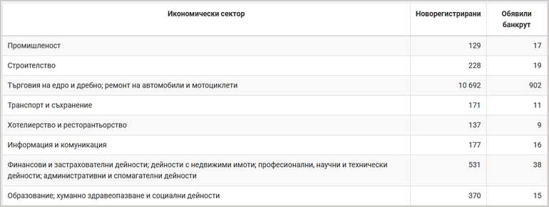 С най-голям относителен дял както при новорегистрираните, така и при обявените в несъстоятелност, са фирмите от сектор G „Търговия; ремонт на автомобили и мотоциклети“ – съответно 86.0 и 87.8%.