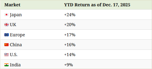 Използвайки данни за ценова възвръщаемост в местната валута на всеки пазар, таблицата по-долу показва лидерите и изоставащите през 2025 г. към 17 декември.