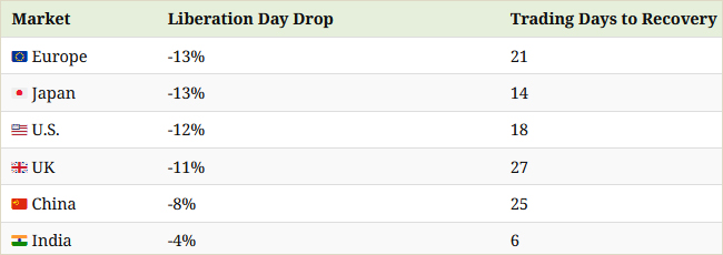 От друга страна, Индия e с най-ниския и най-кратък спад в отговор на тарифите за Деня на освобождението. Само 12% от индийската икономика зависи от износа на стоки, а износът на стоки за САЩ съставлява само 2,1% от БВП на страната.