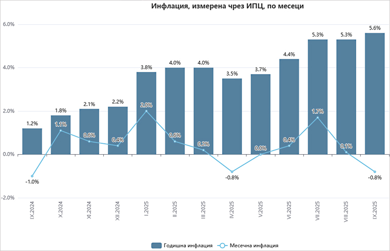 Годишната инфлация продължава да се ускорява през септември с ниво от 5.6%, сочат данни на НСИ. В същото време спрямо предходния месец месечната инфлация е -0.8%. Инфлацията от началото на годината (септември 2025 г. спрямо декември 2024 г.) е 3.4%, а средногодишната инфлация за периода октомври 2024 – септември 2025 г. спрямо периода октомври 2023 – септември 2024 г. е 3.8%.