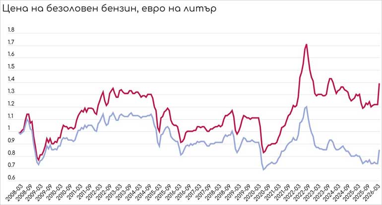 Икономистът от Института за пазарна икономика Лъчезар Богданов публикува във фейсбук профила си графика, илюстрираща промените в цената на горивата през годините.