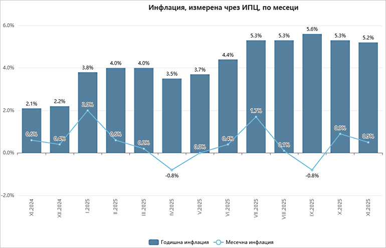 Инфлацията от началото на годината (ноември 2025 г. спрямо декември 2024 г.) е 4.8%, а средногодишната инфлация за периода декември 2024 – ноември 2025 г. спрямо периода декември 2023 – ноември 2024 г. е 4.4%.