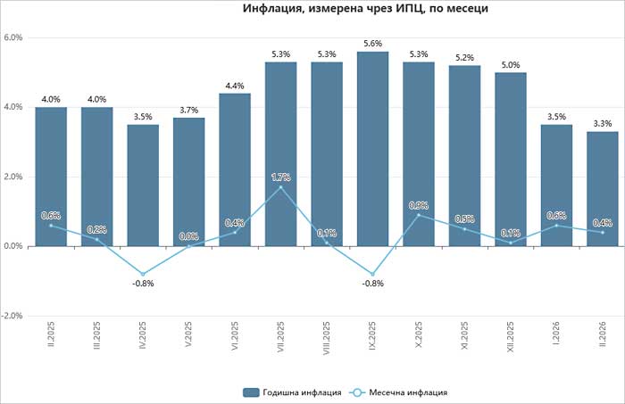 Месечната инфлация спрямо предходния януари е 0.4%, а инфлацията от началото на годината (февруари 2026 г. спрямо декември 2025 г.) е 1.0%. Средногодишната инфлация за периода март 2025 – февруари 2026 г. спрямо периода март 2024 – февруари 2025 г. е 4.5%.
