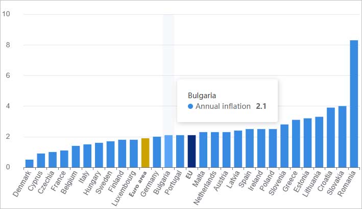 Най-ниските годишни темпове са регистрирани в Дания (0,5%), Кипър (0,9%) и Чехия (1,0%). Най-високите годишни темпове са регистрирани в Румъния (8,3%), Словакия (4,0%) и Хърватия (3,9%). В сравнение с януари 2026 г. годишната инфлация е спаднала в единадесет държави членки, сред които и България, останала е стабилна в четири и се е повишила в дванадесет.