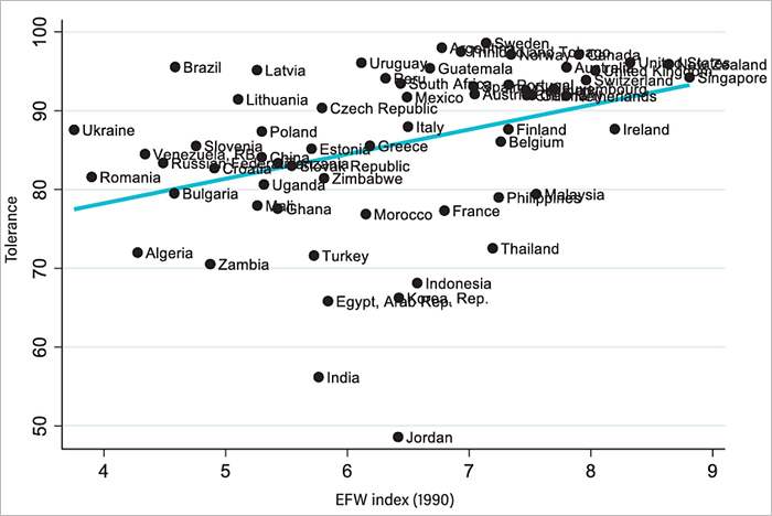 Няколко изследвания на икономистите Никлас Берггрен и Терезе Нилсон разглеждат връзката между толерантността, икономическата свобода и глобализацията. Събраните от тях доказателства сочат към причинно-следствена връзка между нивото на икономическа глобализация и готовността на родителите да възпитават у децата си толерантност. Друг анализ установява, че икономическата свобода играе привидно причинна роля в това родителите да учат децата си на толерантност и да насърчават приемането на хомосексуални и хора от различни раси (виж Фигура 1, позицията на България не е особено радваща, б.р.). Фокусирайки се единствено върху Съединените щати, Берггрен и Нилсон откриват сходна причинност: икономическата свобода увеличава толерантността към хомосексуални, атеисти и комунисти. Друго изследване показва, че икономическата свобода увеличава толерантността към хомосексуални, особено в общества с високо ниво на доверие.