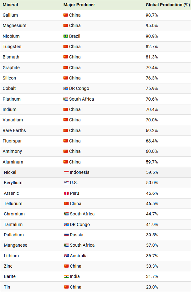Китай доминира в производството на поне 15 критични минерала или минерални групи, изброени в списъка, включително галий (98,7%), магнезий (95%), волфрам (82,7%) и редкоземни елементи (69,2%). Тези материали са жизненоважни за чистата енергия, отбраната и електрониката.