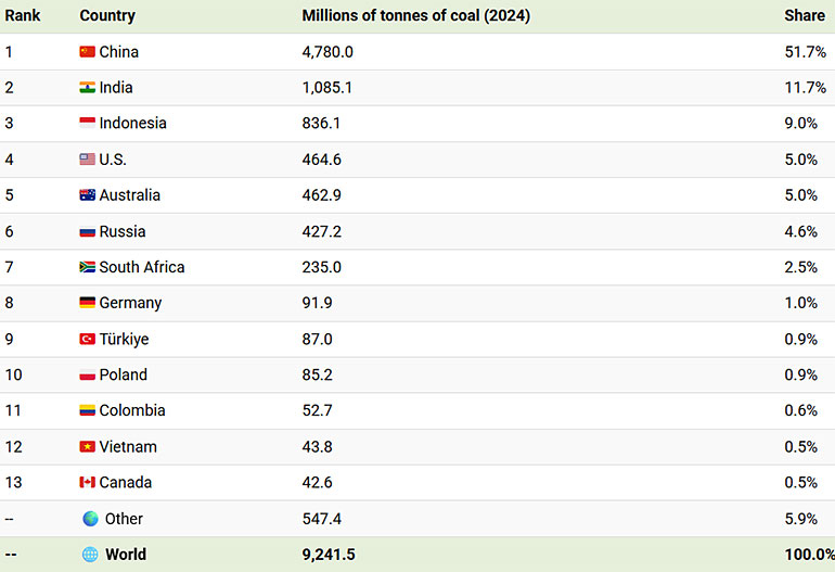 Китай консумира 4 780 милиона тона въглища годишно, над половината от световното потребление, което отразява ролята му на най-големия индустриален производител в света и продължаващата му зависимост от въглища за производство на електроенергия въпреки бързия растеж на възобновяемите енергийни източници. Заедно, първите шест държави представляват 87% от световното потребление на въглища, което подчертава как търсенето е концентрирано в малък брой големи икономики.