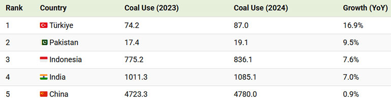 Следващата таблица показва къде потреблението на въглища все още нараства между 2023 и 2024 г.: