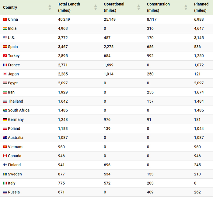 Амбициозните му планове за разширяване добавят 8000 мили в процес на изграждане и близо 7000 планирани. За сравнение, следващата по големина мрежа – Испания – има под 2300 мили в експлоатация.
