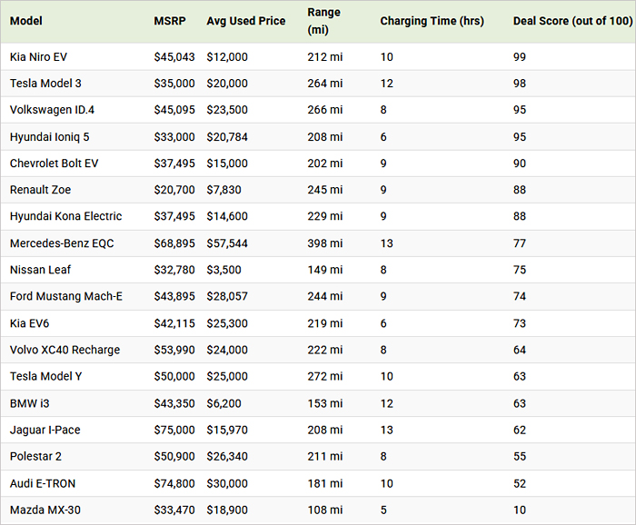 Изданието Visual Capitalist използва данните на eCarsTrade, за да сравни препоръчителните цени на дребно на производителя (MSRP), текущите средни цени на употребяваните превозни средства, пробега, времето за зареждане у дома и общите оценки на сделките за популярни електрически превозни средства. Резултатът показва кои електрически превозни средства предлагат най-добрата комбинация от достъпност, пробег и ефективност на пазара на употребявани превозни средства.