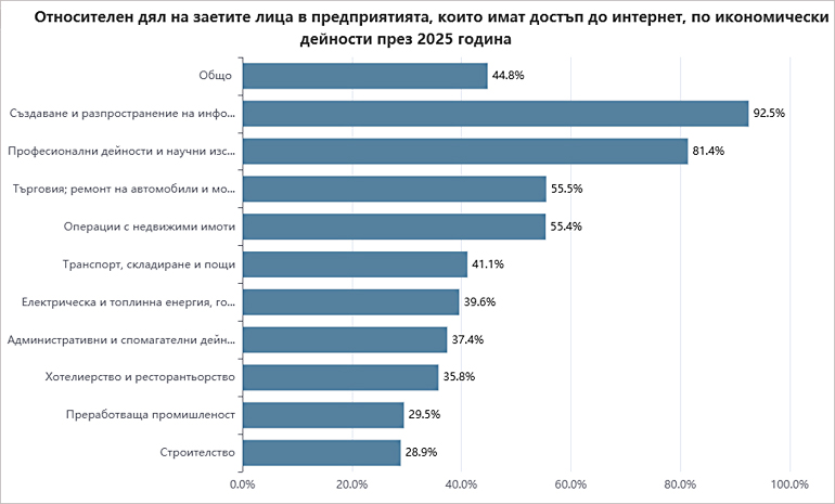 Предприятията, които през 2025 г. използват технологии с изкуствен интелект, са 8.5%, като относителният им дял се е увеличил с 2.0 процентни пункта в сравнение с предходната година. Най-разпространено е използването на тези технологии сред фирмите с 250 и повече заети лица – 26.2%.