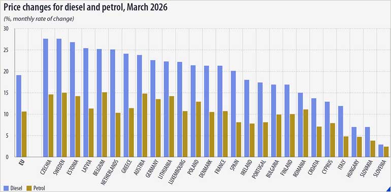 Цените и на двата вида гориво са се повишили във всички страни от ЕС между февруари и март 2026 г. При дизела най-голямо увеличение е регистрирано в Чехия и Швеция (и двете +27,6%), Естония (+26,8%), Латвия (+25,4%), Белгия (+25,2%) и Нидерландия (+25,1%), докато най-ниско увеличение е регистрирано в Словения (+2,9%), Словакия и Унгария (и двете +7,0%). Всички останали страни от ЕС са отбелязали увеличение над 10%.