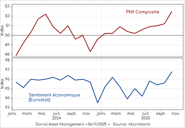 В свой анализ за fibee.fr Франсоа-Ксавие Шоша наблюдава ясно възстановяване на бизнес климата в Европа през октомври: индексът на икономическите настроения* достига 30-месечен връх, а индексът на производствената активност (PMI)** се повишава до 52,5. Спадът на темпа на инфлацията, намаляването на нарежението в китайско-американското търговски отношения и стабилизирането на еврото допринасят за това подобрение, но основната причина остава вътрешното търсене.