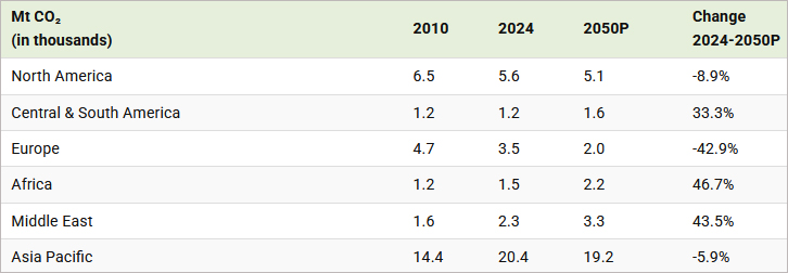 Подобно на Европа, се прогнозира, че емисиите в Азиатско-тихоокеанския регион и Северна Америка ще намалеят с течение на времето, тъй като населението се свива, а зелените технологии получават по-широко приложение.