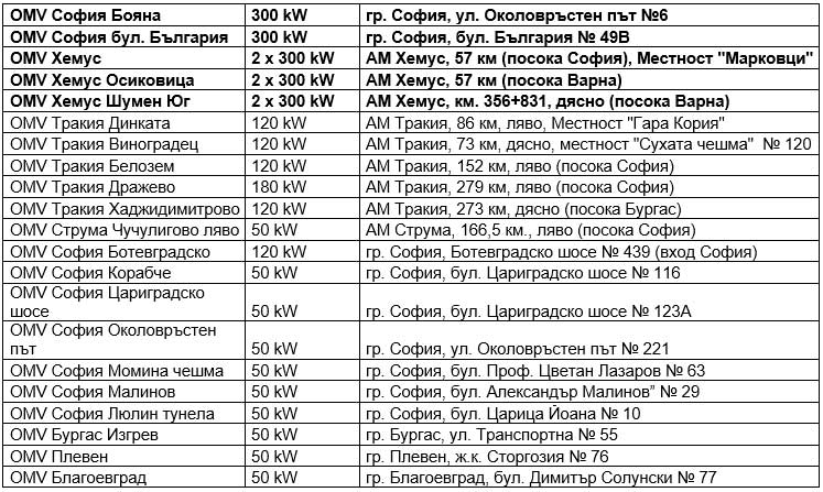 Списък на OMV eMotion зарядни станции в България: