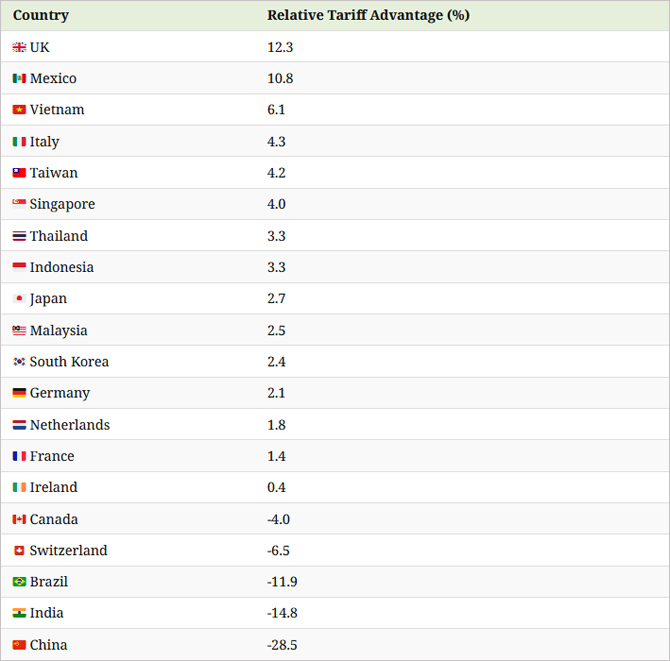 Global Trade Alert сравнява тарифните ставки между конкурентите, за да класира кои държави са спечелили или загубили позиции. Крайният резултат е оценка на относителните тарифни предимства (положителни числа) и недостатъци (отрицателни числа).