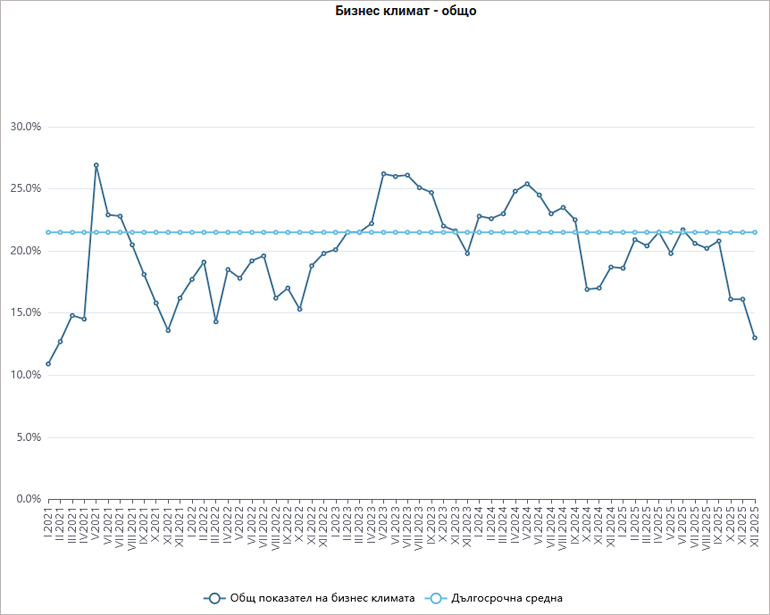 През декември общият показател на бизнес климата се понижава с 3.1 пункта в сравнение с предходния месец (от 16.1% на 13.0%), като намаление на показателя е регистрирано във всички наблюдавани сектори – промишленост, строителство, търговия на дребно и услуги. Тези данни на НСИ сочат петгодишно дъно за бизнеснастроенията през декември. От месец февруари 2021 година бизнес климатът у нас не е показват толкщова негативни тенденции.
