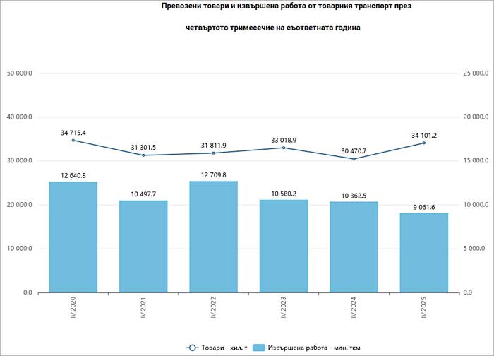 През четвъртото тримесечие на 2025 г. в сравнение със съответното тримесечие на 2024 г. превозените товари от сухопътния и водния товарен транспорт нарастват с 11.9%, докато извършената работа намалява с 12.6%. Това сочат предварителните данни на НСИ.