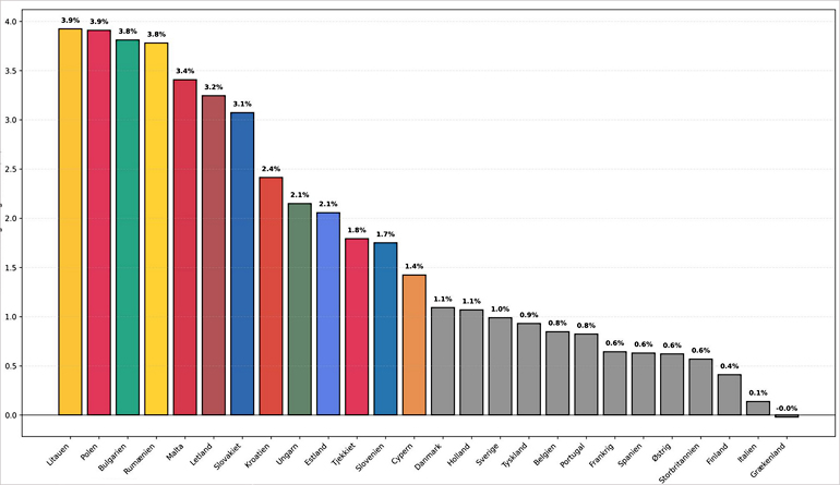 И да – става дума за БВП спрямо броя на населението, а растежът дори в успешна Дания е бил само малко над 1%. Останалата част от растежа на датския БВП идва от увеличението на населението, включително вследствие на това, че полски, литовски и румънски работници допринесоха изключително положително за датския пазар на труда през последните две десетилетия. Без тях датското благосъстояние и публичните финанси щяха да изглеждат значително по-зле.