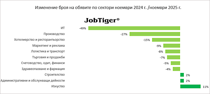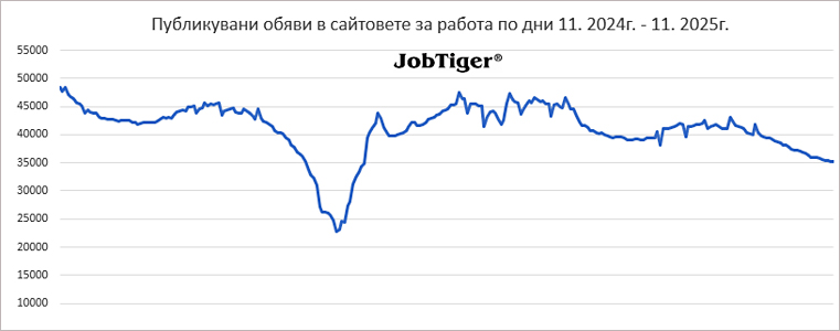 Осезаемо спадат обявите за работа през ноември, сочи анализът на HR компанията и кариерния сайт JobTiger. Спрямо предходния октомври търсенето на служители е с 13 % по-слабо, като предложенията са с около 5300 по-малко. Сериозен проблем индикират и данните спрямо година по-рано, като стойностите сочат 8% спад.