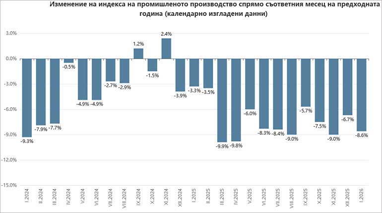 Продължава дългата серия от месечни спадове на индекса на промишленото производство. През януари 2026 г. той се понижава с 2.6% спрямо предходния месец декември, а на годишна база спадът е по-голям – с 8.6%, сочат данните на НСИ.