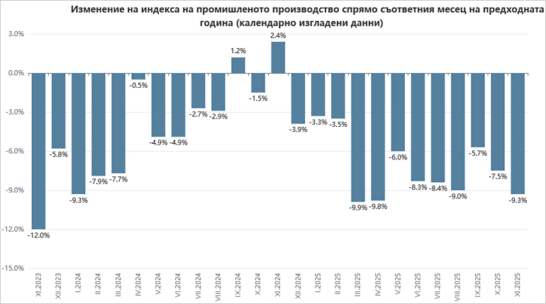 Промишленото производство през ноември регистрира спад и спрямо предходния месец с 1.7%, и още по-ясно изразен на годишна база с 9.3%, което е най-голямо намаление от април 2025-та, сочат данните на НСИ.