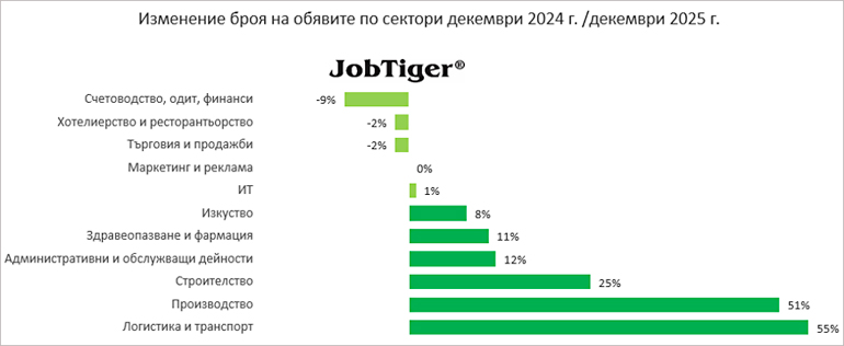 Сравнено на годишна база JobTiger отчита положителни резултати. Ръст на обявите има в повечето сектори. Изключение правят секторите „Счетоводство, одит, финанси“, в който наблюдаваме годишен спад от 9%, „Хотелиерство и ресторантьорство“ и „Търговия и продажби“ с 2% спад.