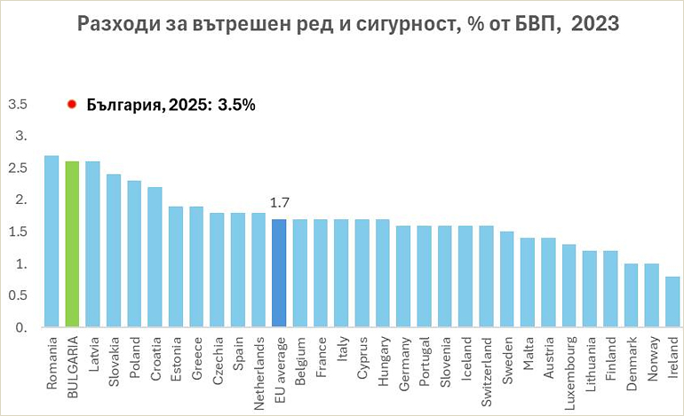 По думите му държавата харчи за полиция, пожарна, затвори и съдебна система общо 2.6% от БВП през 2023, което ни нарежда на второ място след Румъния. Това е резултат както от относително високо ниво на възнагражденията спрямо средните за пазара на труда в страната, така и заради относително (спрямо населението) висок брой наети в тези системи.